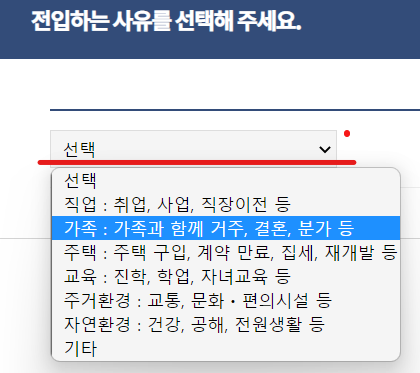 전입하려는 사유에는 여러가지가 있습니다. 직업상의 이유, 가족, 주택, 교육, 주거환경, 자연환경 등의 이유들이 있으니 선택합니다.
