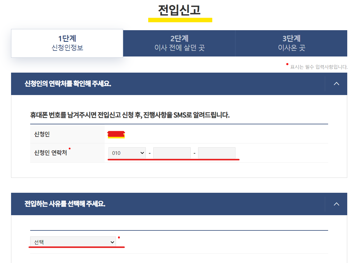 그리고 이사 온 곳을 선택합니다. 주소는 상세하게 호수까지 모두 입력하며 다가구 주택여부는 등기부등본을 통해 확인하시어 선택합니다.