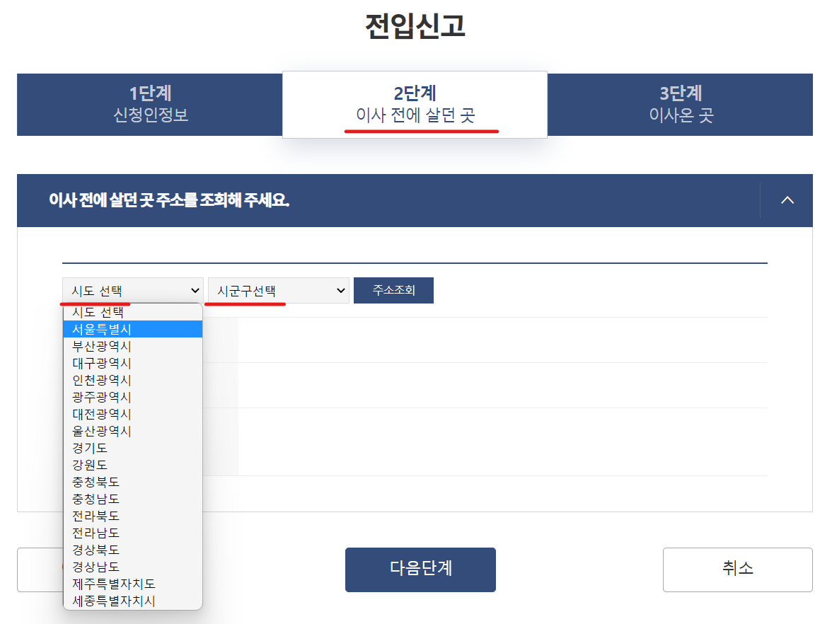 이사 가기 전 기존의 집 주소를 선택합니다.
