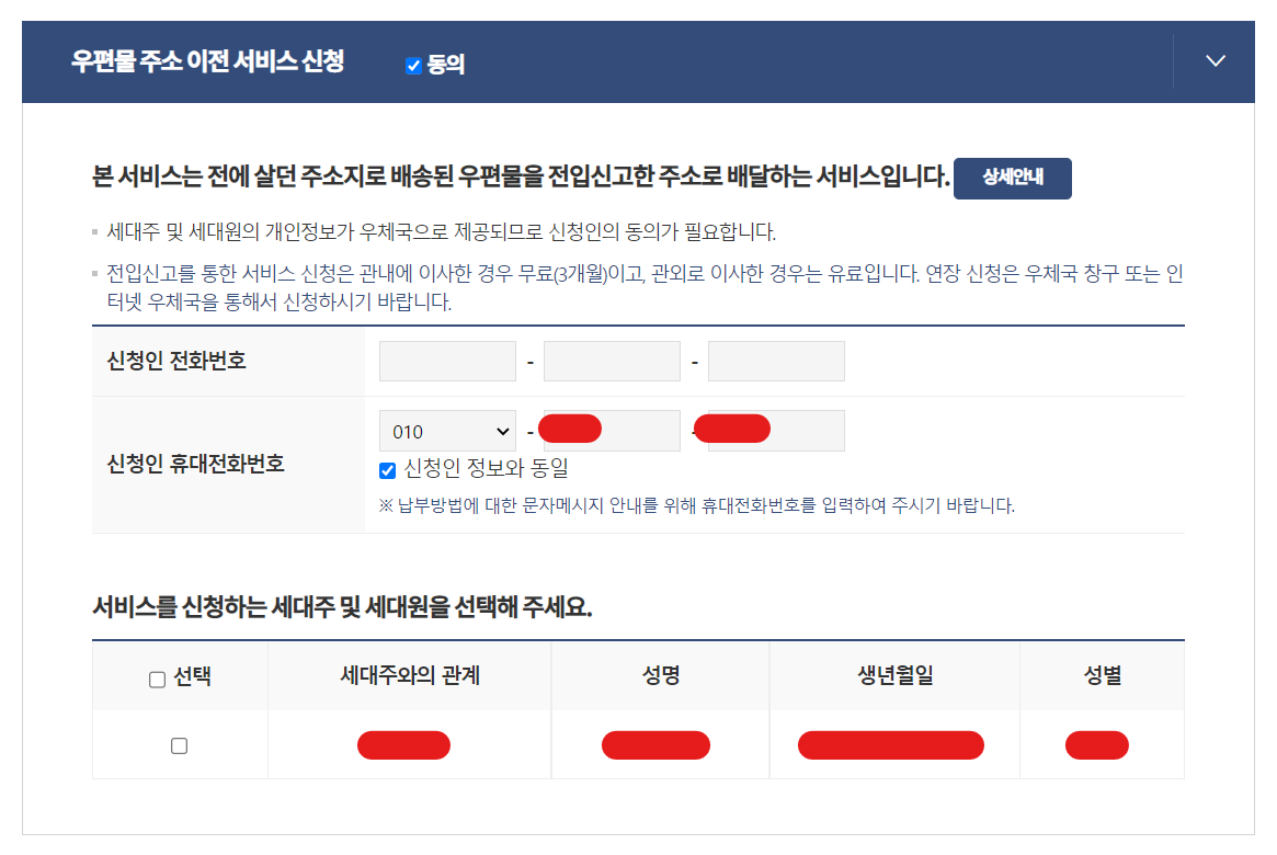 우편물 주소 이전 서비스는 꼭 신청해야 합니다. 안그럼 이전 주소지로 계속 기존의 개인정보가 담겨있는 많은 배달물들이 가게되기 때문이지요. 서비스를 신청하고 마지막으로 넘어갑니다.